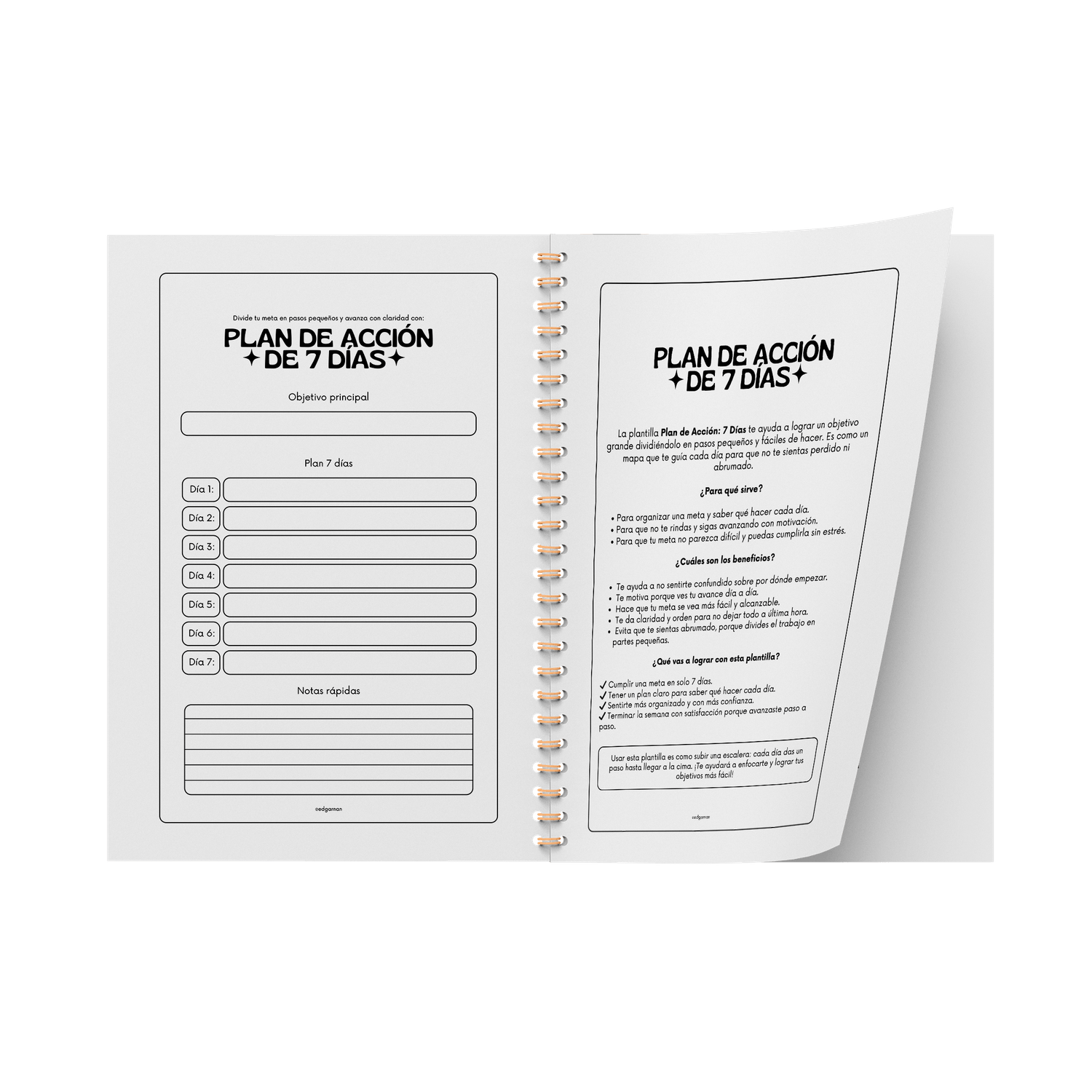 Cada sección incluye indicaciones claras y prácticas que te guiarán paso a paso para reflexionar, planificar tu día cumplir tus objetivos y mantenerte enfocado en tus metas.